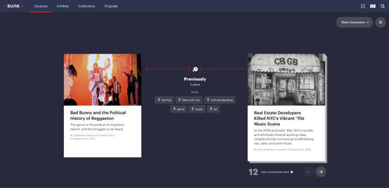 Select the “View Connections” button to explore more excerpts as connected in Bunk. You may choose different icons as you explore. Note the associated tags that connect each excerpt to another. Explore one or more tags.