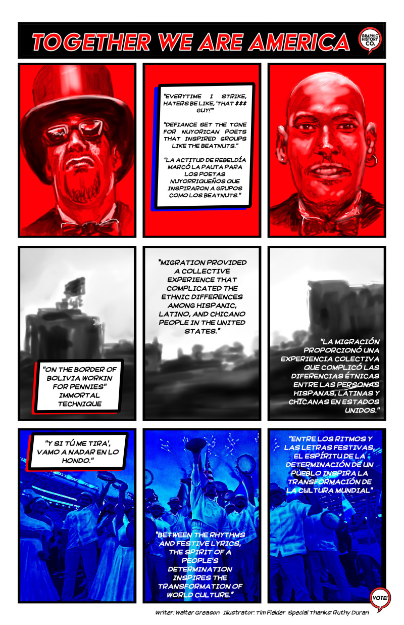 Building on our earlier exploration of artists as historians in Kendrick Knows and Dearly Beloved, this learning resource extends that work through visual storytelling in the Bad Bunny Halftime History's comic explainer, “Together We Are America.” Our colleagues at Graphic History Co. offer a powerful two-page comic explainer that helps educators unpack complex history through art. The accompanying comic panel analysis document, graphic organizer, and slides are designed to be used together. The document can be printed so that students can closely annotate and analyze the panels, while the slides support whole-class viewing, discussion, and guided analysis. Together, these materials scaffold learning, center historical context, and engage students thoughtfully with the themes presented.