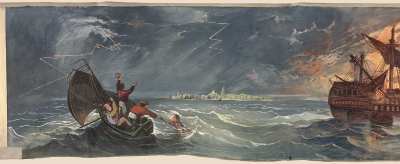 In the first half of the nineteenth century Americans had little knowledge of what it was actually like to be on a whaling voyage. There were few ways to closely understand and experience far-off locations in general. Human beings were decades away from widespread electricity and a century away from technology such as radios, which would bring the outside world into their homes. Yet this period was also an era of popular entertainment marked by illusion, spectacle, the exotic, and the unknown. The traveling circus, pantomimes, and public theaters were just some forms of popular entertainment during this period that allowed Americans to “experience” far-off lands. One such method of immersing people in a particular time and place was the moving panorama. These were large paintings set up on scrolls, often accompanied by music and narration. Moving panoramas moved across American towns and cities, in some ways they were the precursor to early motion pictures.