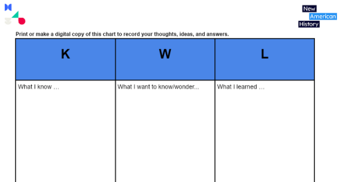 KWL Chart: a method to foster thinking and idea/question generation amongst students. “K” stands for what students already KNOW about the topic. “W” stands for what they WANT to know. And “L” stands for what they LEARNED after the learning experience concluded.