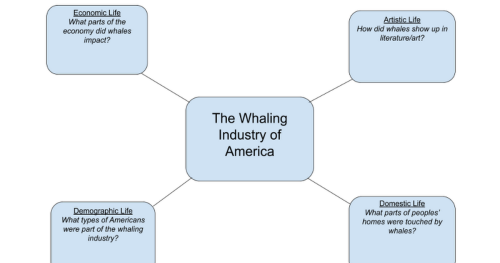 In an excerpt from the BackStory podcast archives, Yale historian Joanne Freeman calls whales “nothing less than the chemical factory of the 19th century.” When considering early booming American industries, one might not immediately jump to the largest mammals on Earth. But for many locations along the coast of New England, whales and whale products found their way into many aspects of life. To begin your investigation, you’ll create a Concept Map that explores four areas of life touched by the whaling industry- economic life, artistic life, demographic life, and domestic life. (Your teacher may print a copy for you, or create and use a digital copy as directed by your teacher.)