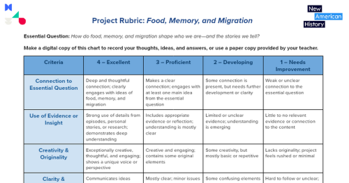 The Elaborate section offers students choice-based creative extensions to synthesize their learning from Finding Edna Lewis Episodes 2 & 3. Each option invites students to reflect on themes of food, identity, migration, and legacy while connecting personally to Edna Lewis’s story. These projects encourage multimodal expression—visual, written, audio—and can be adapted for individual or group work. Students choose one of five options: 1) Share a personal food story through audio, 2) Trace migration journeys visually, 3) Celebrate food legacies through ‘Zines, 4) Curate an exhibit exploring food and identity, and 5) Write a reflective letter to Edna Lewis. These tasks support differentiated learning and deepen students’ understanding of how culture, community, and food shape personal and collective histories. The section also includes a rubric to assess the students’ projects.