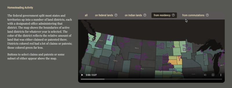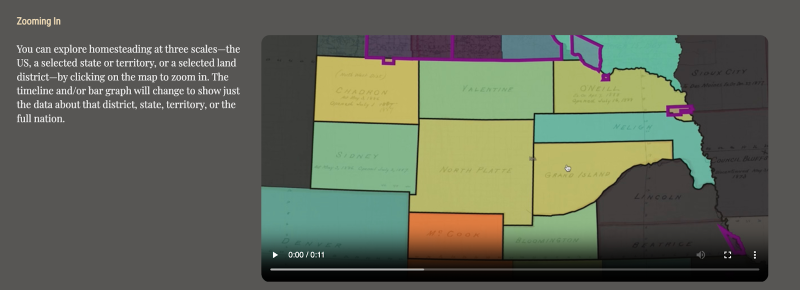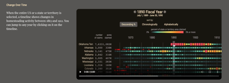 The third video, “Change Over Time,” illustrates that as the entire US or a state or territory is selected, a timeline shows changes in homesteading activity between 1863 and 1912. You can jump to any year by selecting it on the timeline.