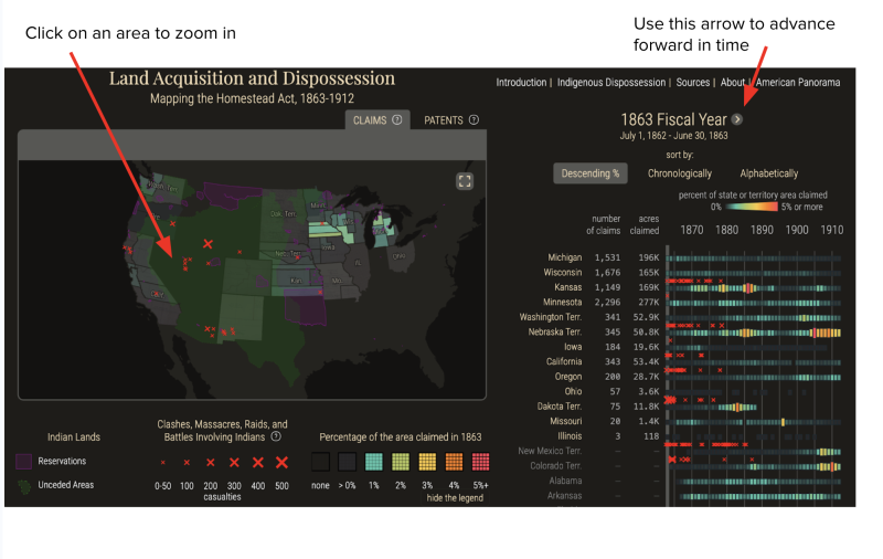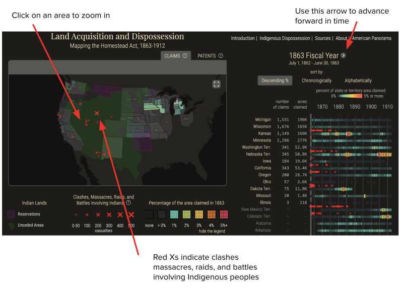 Begin by reading the “Homesteading and Indigenous Dispossession” section from “Land Acquisition and Dispossession: Mapping the Homestead Act, 1863-1912,” in American Panorama.