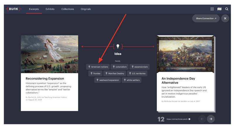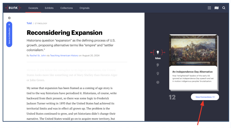 - Next, you are going to use Bunk’s tagging feature to find another source that discusses the idea of the frontier. In Bunk, select the “View Connections” button.