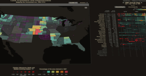 Take a few minutes to explore Land Acquisition and Dispossession Mapping the Homestead Act, 1863-1912, which visualizes the history of the Homestead Act throughout its first 50 years. Navigate to the map using the orange “Explore the Map” button located in the header of the homepage. The map shows the boundaries of active land districts from 1863-1912. The color of the district reflects the relative amount of land that was either claimed or patented there. Districts colored red had a lot of claims or patents; those colored green had far fewer. Buttons to select claims and patents, or some subset of either, appear above the map.
