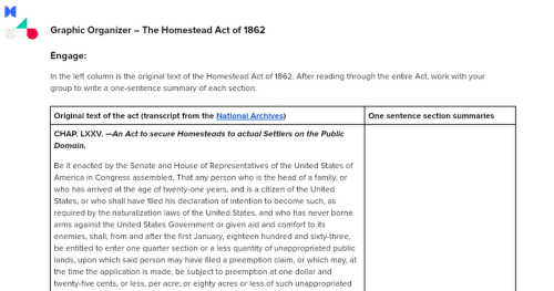 Use this graphic organizer to read a transcribed version of the Homestead Act. Read the text in pairs or small groups, as directed by your teacher.