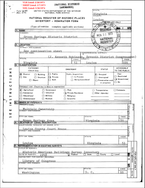“NATIONAL REGISTER of HISTORIC PLACES INVEMTORY - NOMINATION FORM.” 2AD. Https://Www.dhr.virginia.gov/Wp-Content/Uploads/2018/04/054-0111_GreenSpringsRuralHD_1973_Nomination_NHL-NRHP.pdf