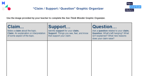 These Learning Resources use Harvard University’s Project Zero thinking routines. The specific routines used are: the See-Think-Wonder thinking routine, the Claim-Support-Question thinking routine, the Main-Side-Hidden thinking routine, the Word-Phrase-Sentence thinking routine, and the Circle of Viewpoints thinking routine.