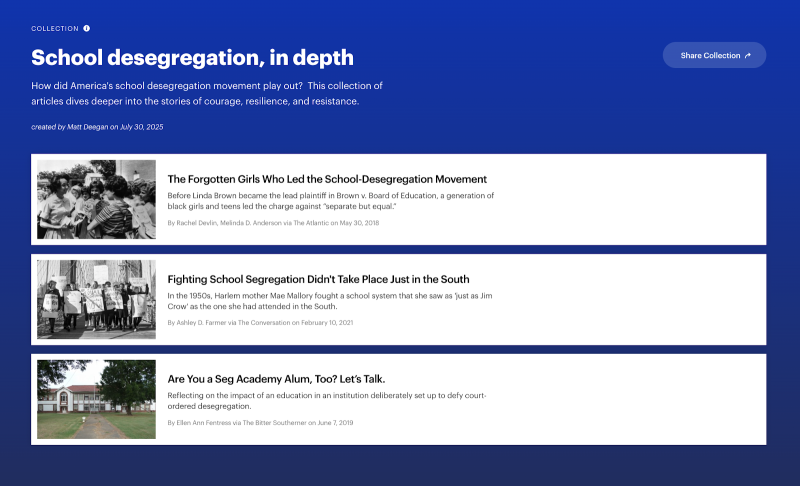 “School Desegregation, in Depth.” Bunk History. Accessed July 31, 2025. https://www.bunkhistory.org/collections/x6cd1a.