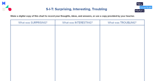 The S-I-T: Surprising, Interesting, Troubling protocol from Facing History allows students to make their thinking visible by using a structured table that helps them categorize their thoughts clearly and precisely. It also allows students to demonstrate their engagement with the text, as they note their reactions to various parts of the material. A template is provided for you to modify as needed, for students to make a digital copy, or to print paper copies for your students as needed.