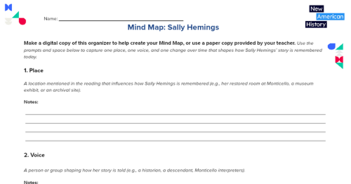 Encourage students to keep their mind maps simple—this is a thinking tool, not an art project. Before they begin, model a quick example on the board so they understand what counts as a place, a voice, and a change in interpretation. Remind them to pull details directly from the Bunk excerpts or connections they explore rather than guessing. As you circulate, prompt students with questions: Whose perspective is influencing this story? Or what has shifted about how Hemings is remembered? If students get stuck, suggest they choose just one strong detail from the reading and build from there. Finally, reassure them that the goal is to visualize ideas quickly to support deeper discussion—not to create a perfect diagram. A simple organizer is provided to assist them in their planning.
